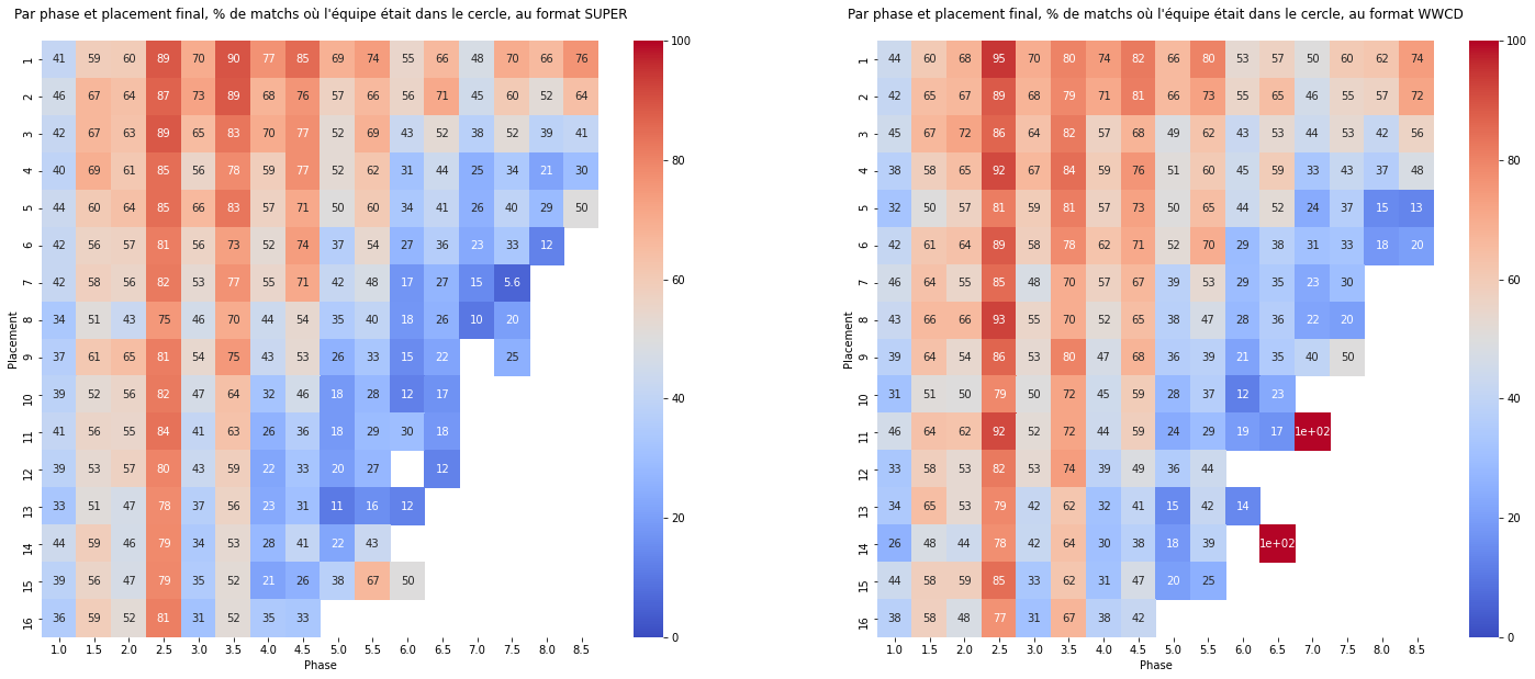 En entrant un peu plus dans le détail, on observe qu’en effet 80% des matchs joués au format WWCD se terminent dans la dernière phase possible, là où ça n’est le cas que pour un peu plus de 60% des matchs joués au format SUPER.